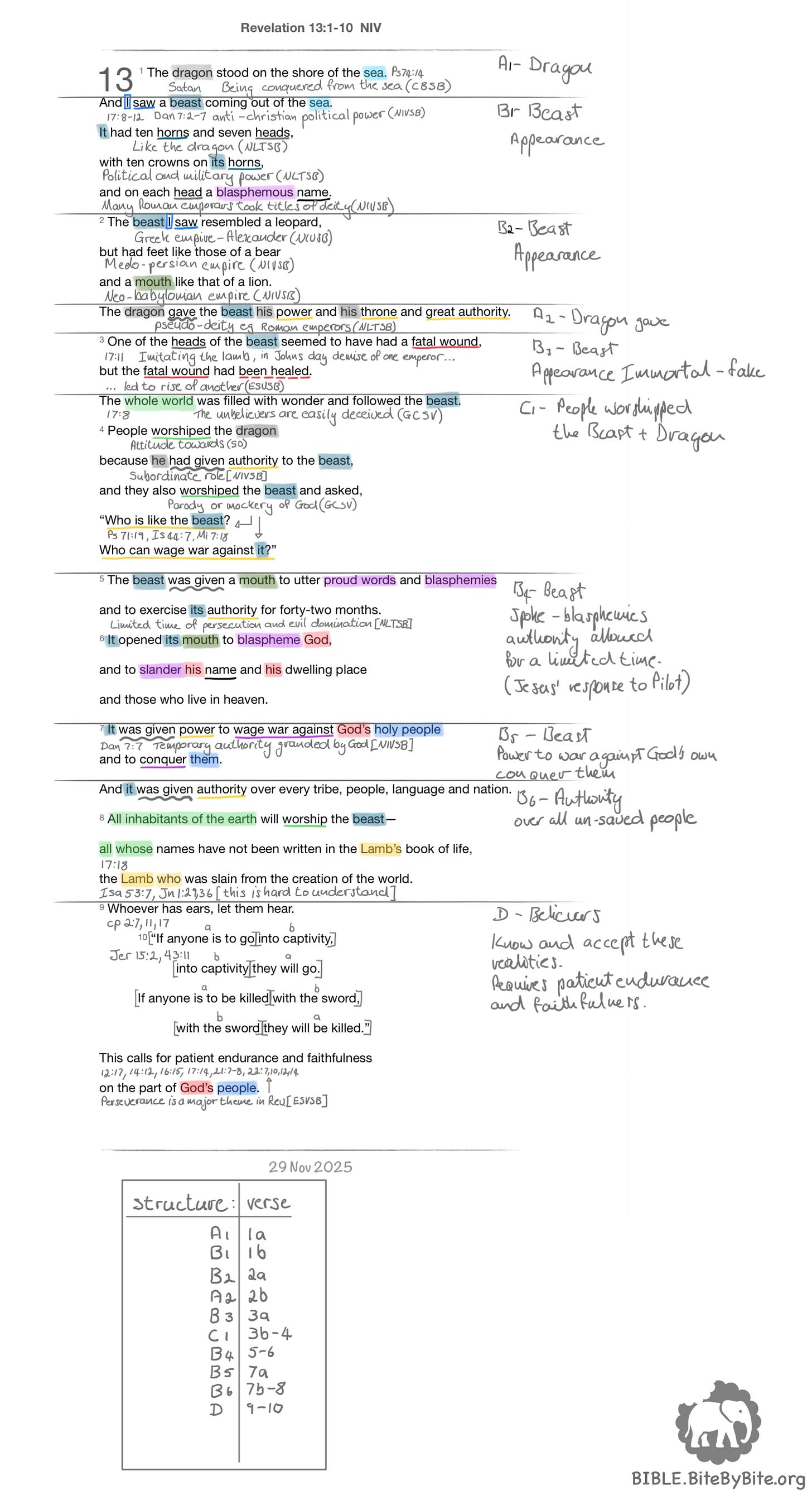 Your markings rightly group the appearance and empowerment sections to show how the beast is essentially the dragon “incarnate” in socio-political structures. This is a key interpretive point: evil empire/system is Satan’s visible proxy on earth.