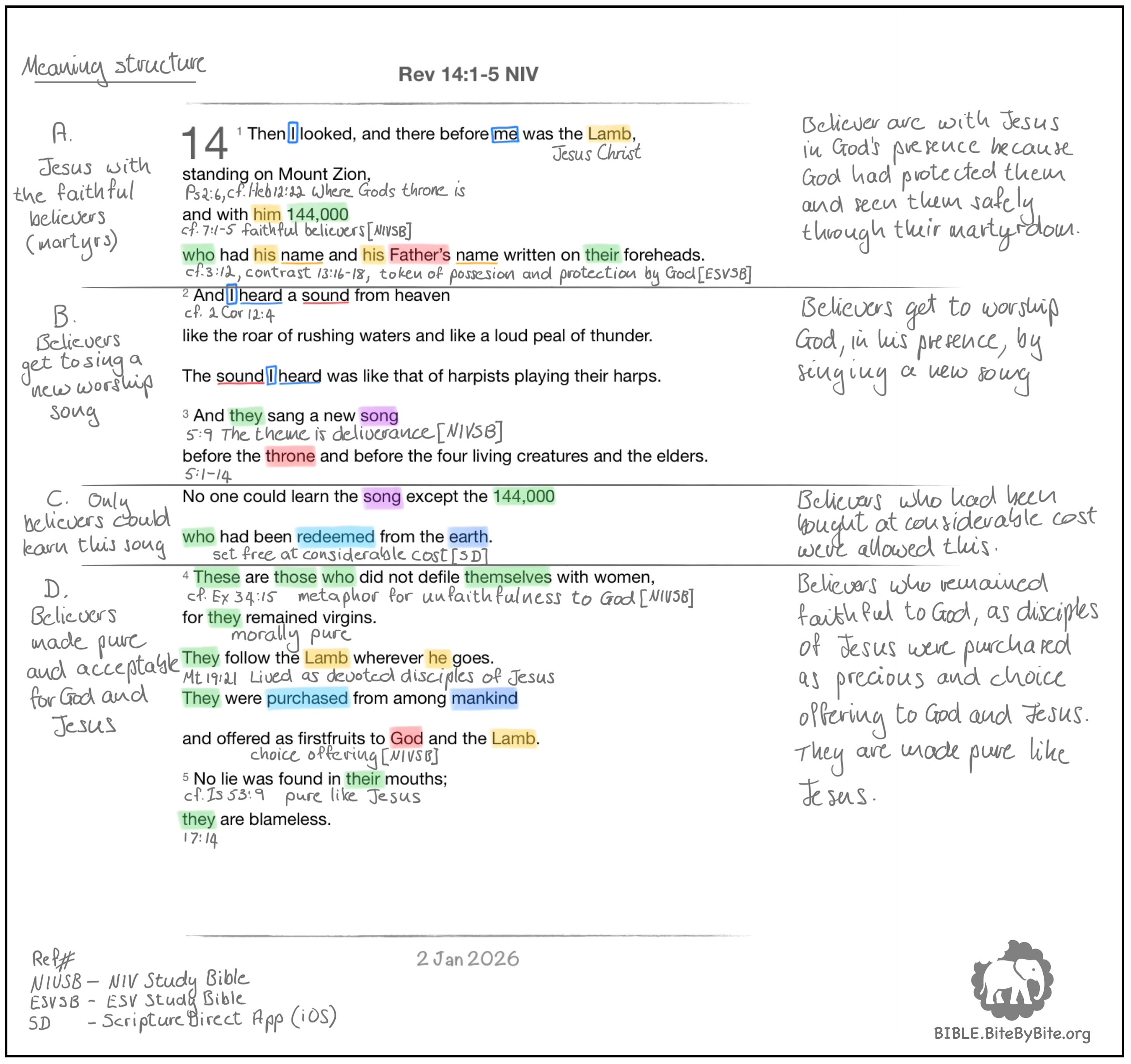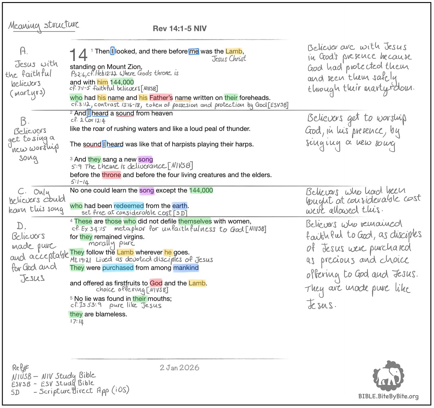 Thematically: Your reading emphasizes triumphant, protected believers (martyrs) with the Lamb in heavenly Zion—redeemed at cost, exclusively worshiping in purity/devotion. Markings reinforce this: green cohesion for the group, yellow centrality of Lamb-following, red divine realm, light/dark blue redemption from earth. The “new song” (purple) as deliverance echoes Rev 5, contrasting ch. 13 persecution. Symbolic virginity as fidelity is correct (cf. Ex 34:15 note). Overall, a coherent evangelical interpretation stressing Christ’s victory and believer conformity.